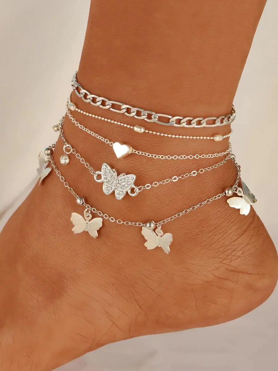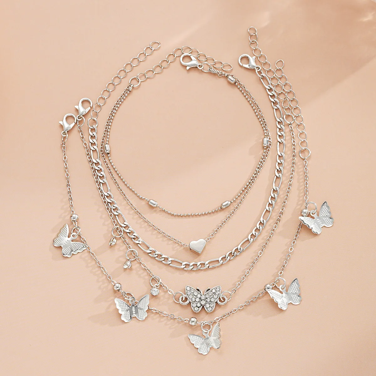 Saashi Fashionable Multi-Layered Butterfly Anklet 4-Piece Set with Beaded Heart Chain Beach Vacation