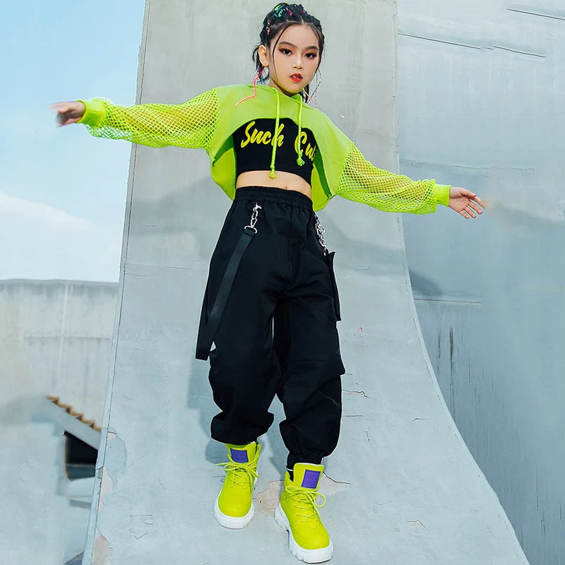 Saashi Jazz Costume Hip Hop Girls Clothing: Green Tops Net Sleeve Black Hip Hop Pants