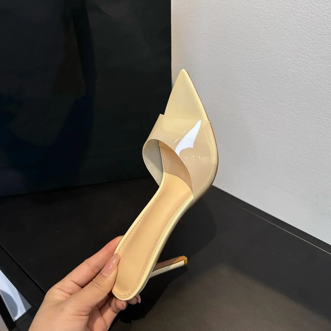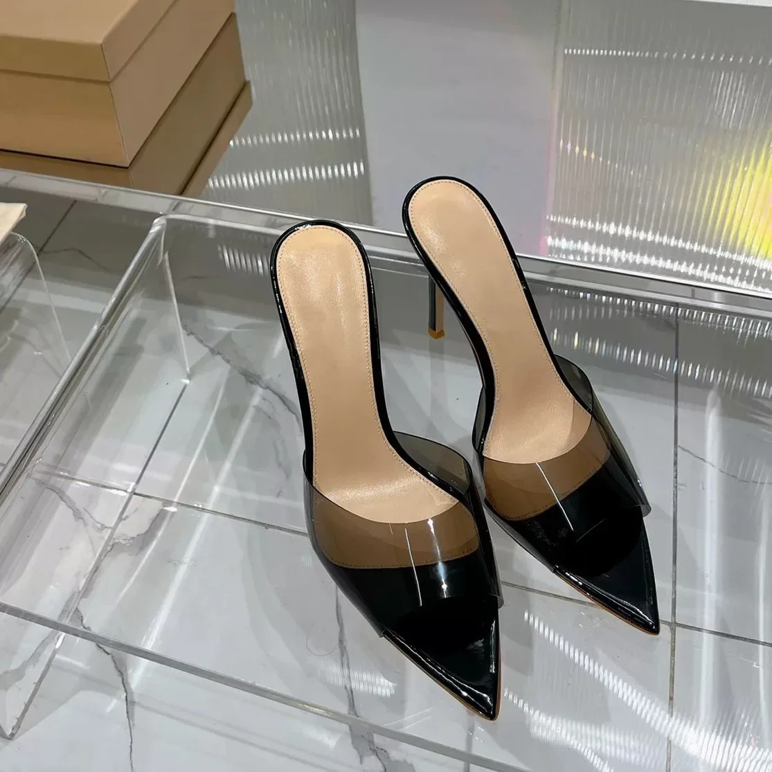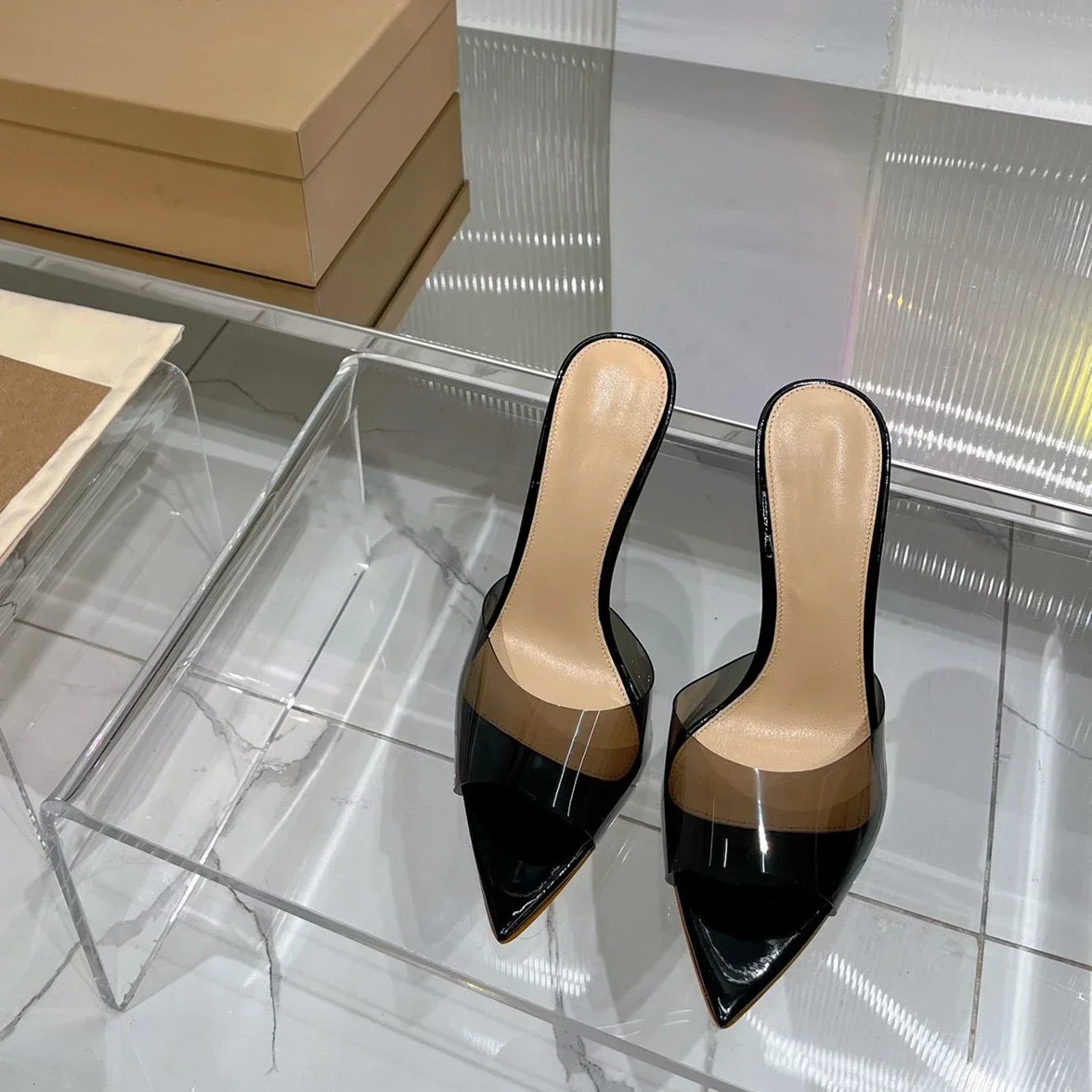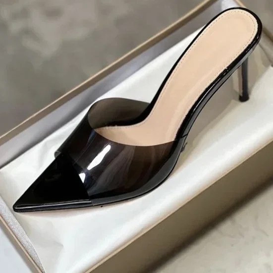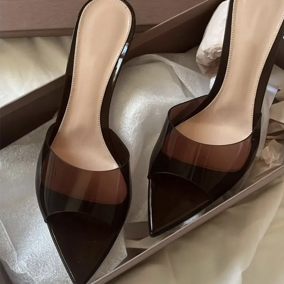Saashi Transparent High Heeled Slippers for Women Fashion Slim Heeled Pointed Open Toe Flip Flops