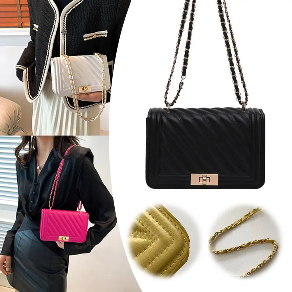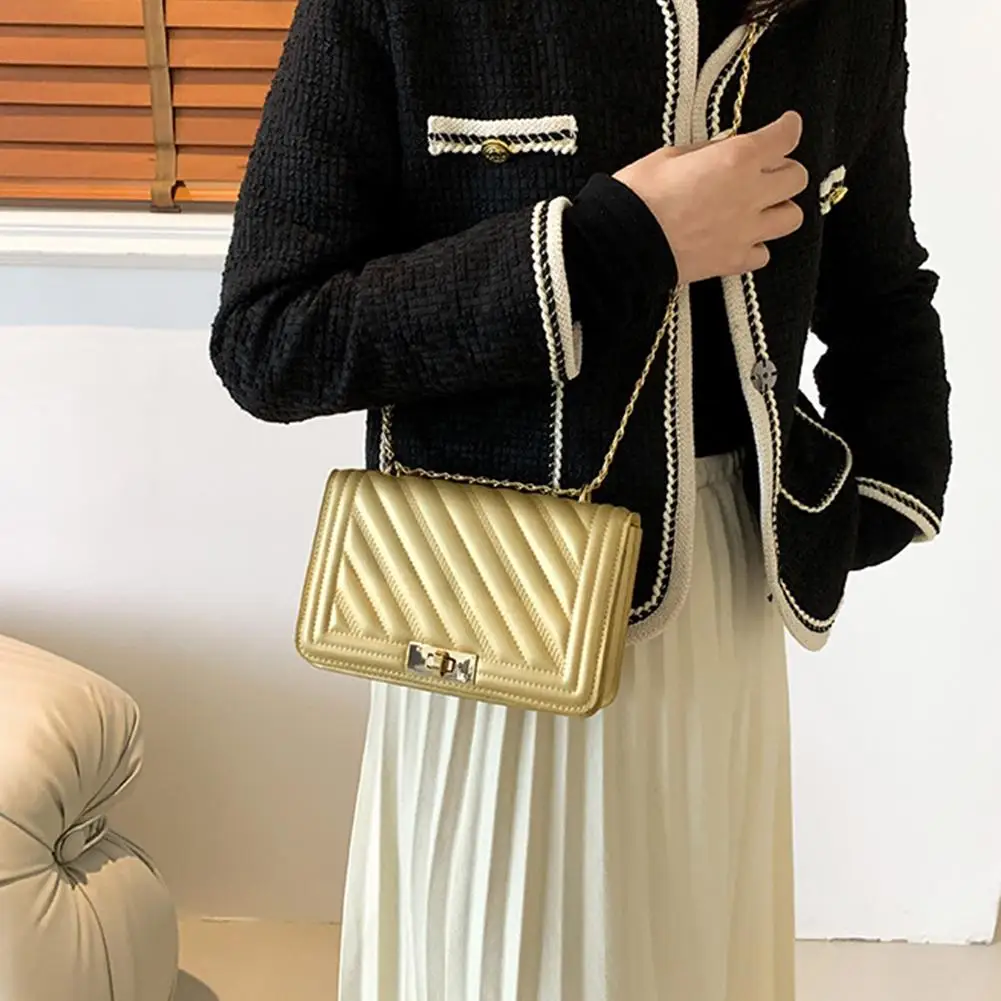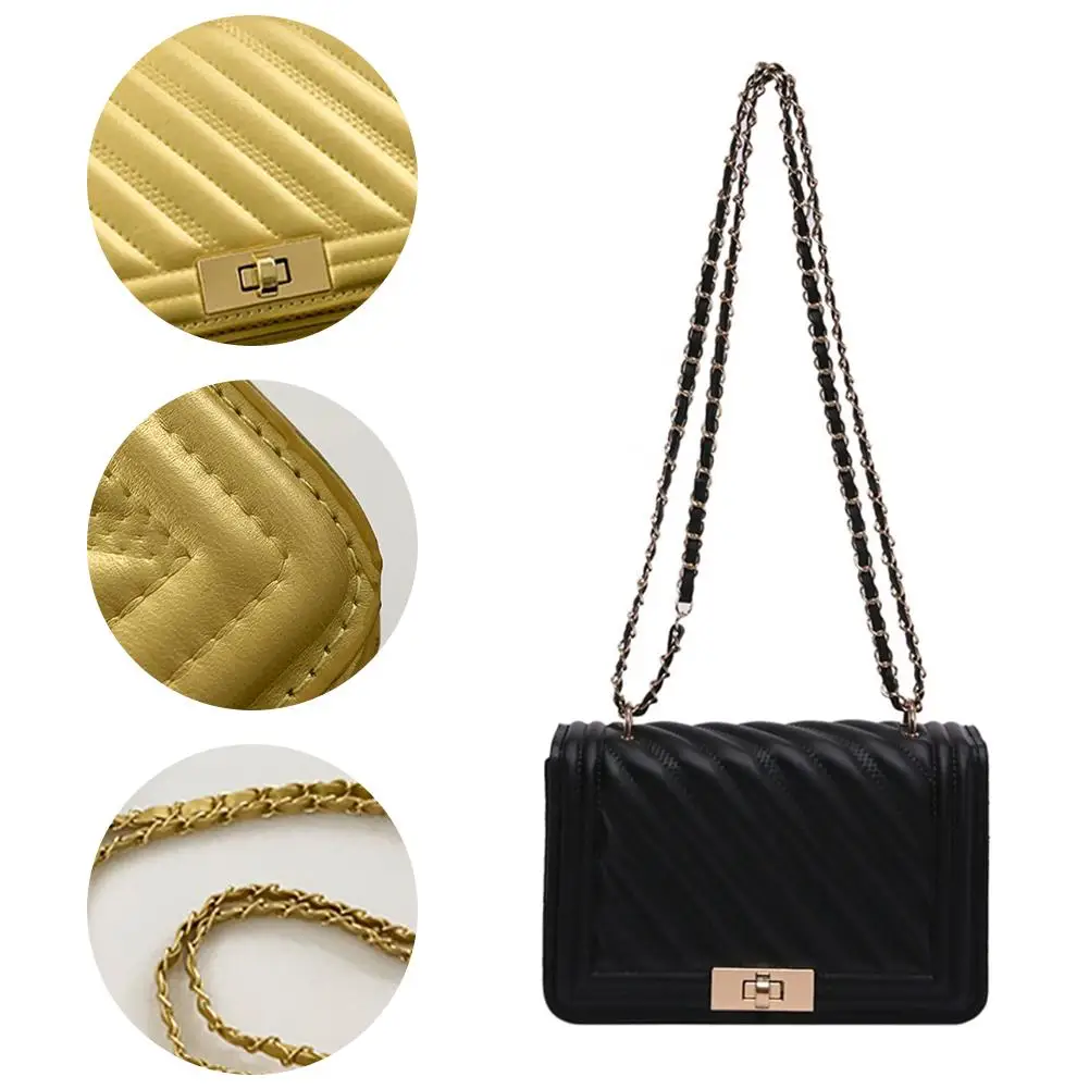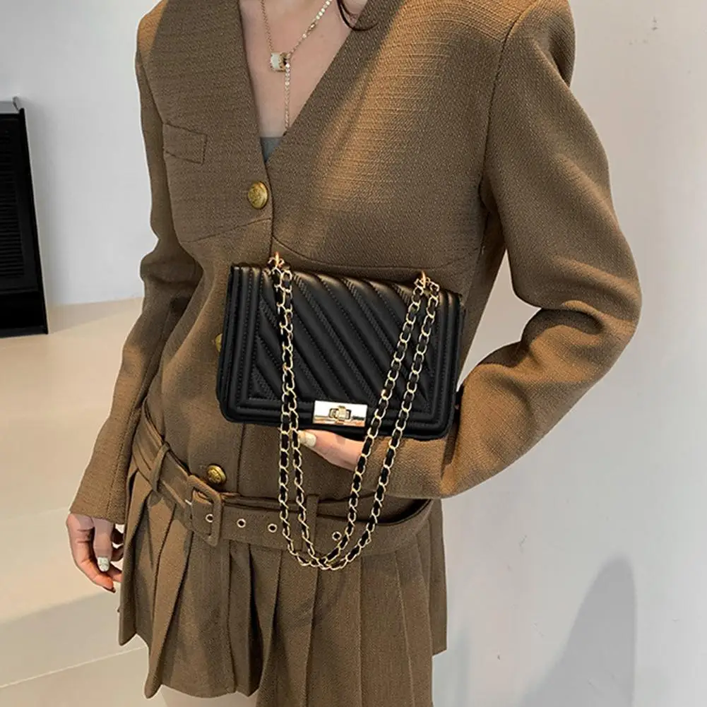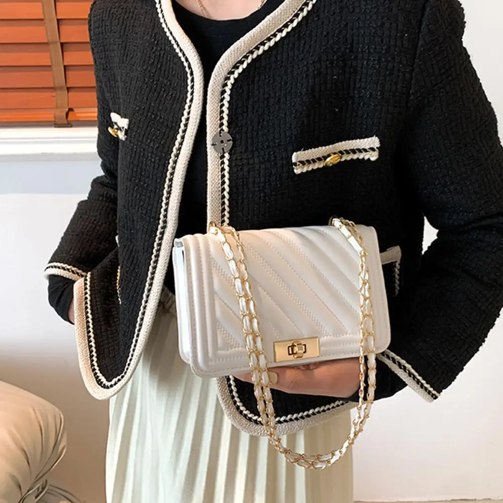 2. Elegant Hardware & Chain Strap: The bag is accentuated with gleaming gold-tone hardware, including a secure turn-lock clasp that adds a sophisticated accent. The versatile chain strap, interwoven with matching material, allows for comfortable wear as a shoulder bag or a crossbody.