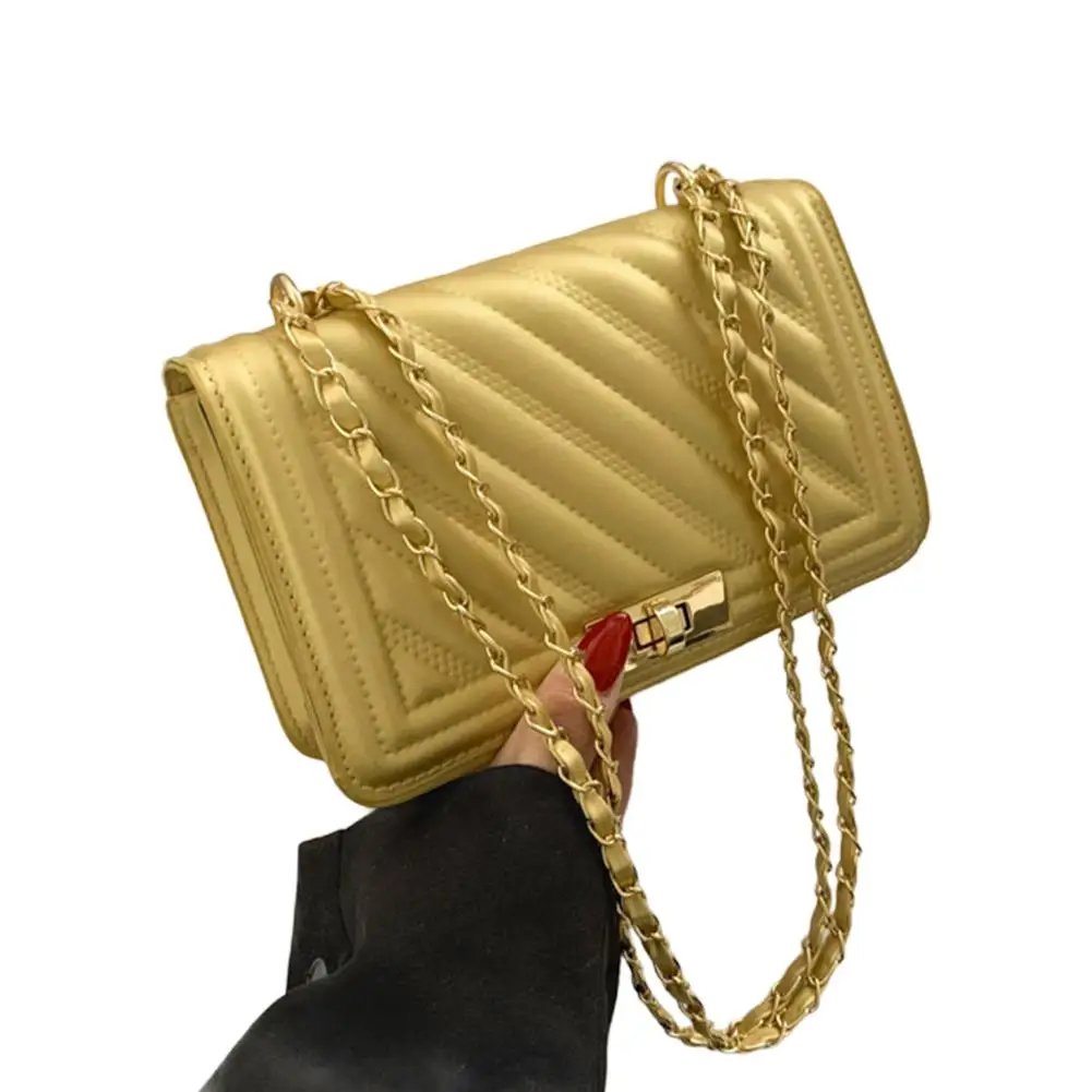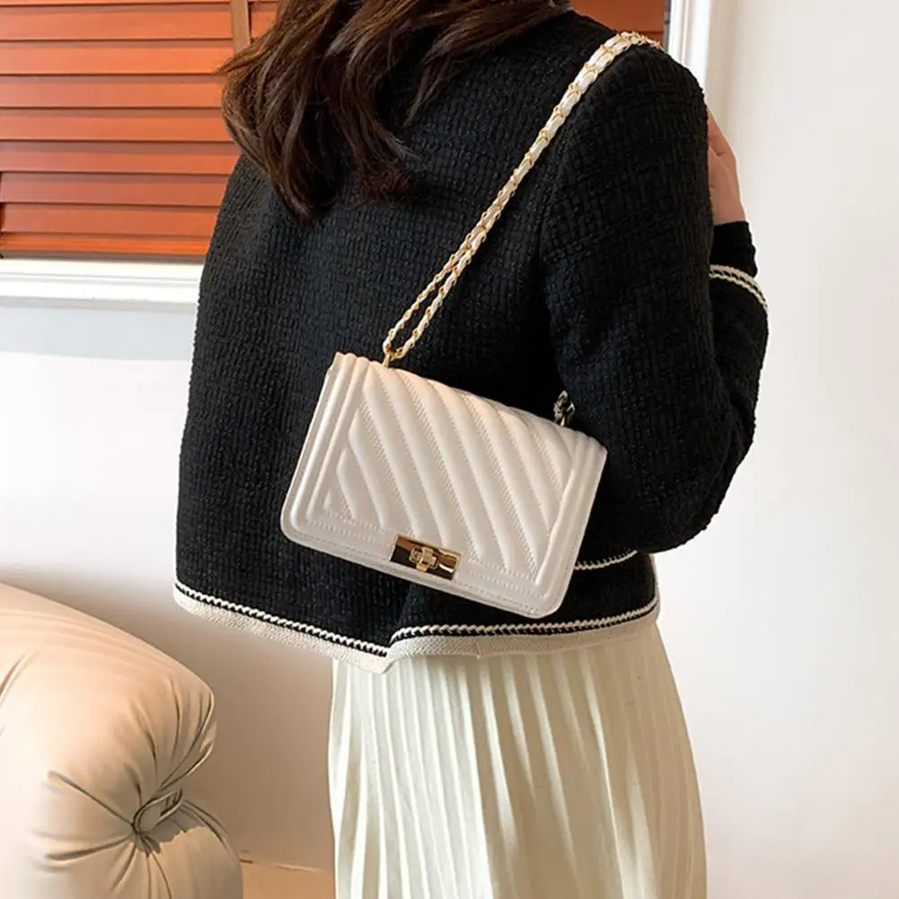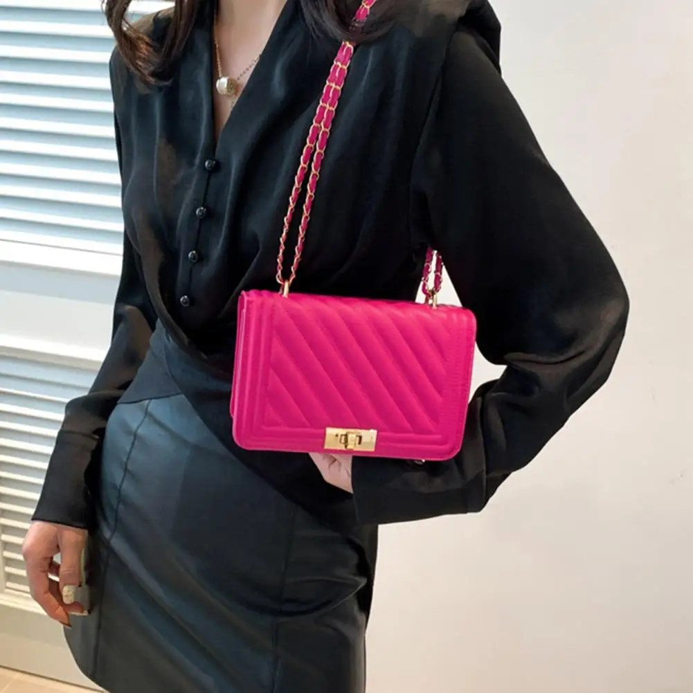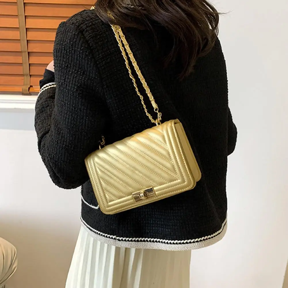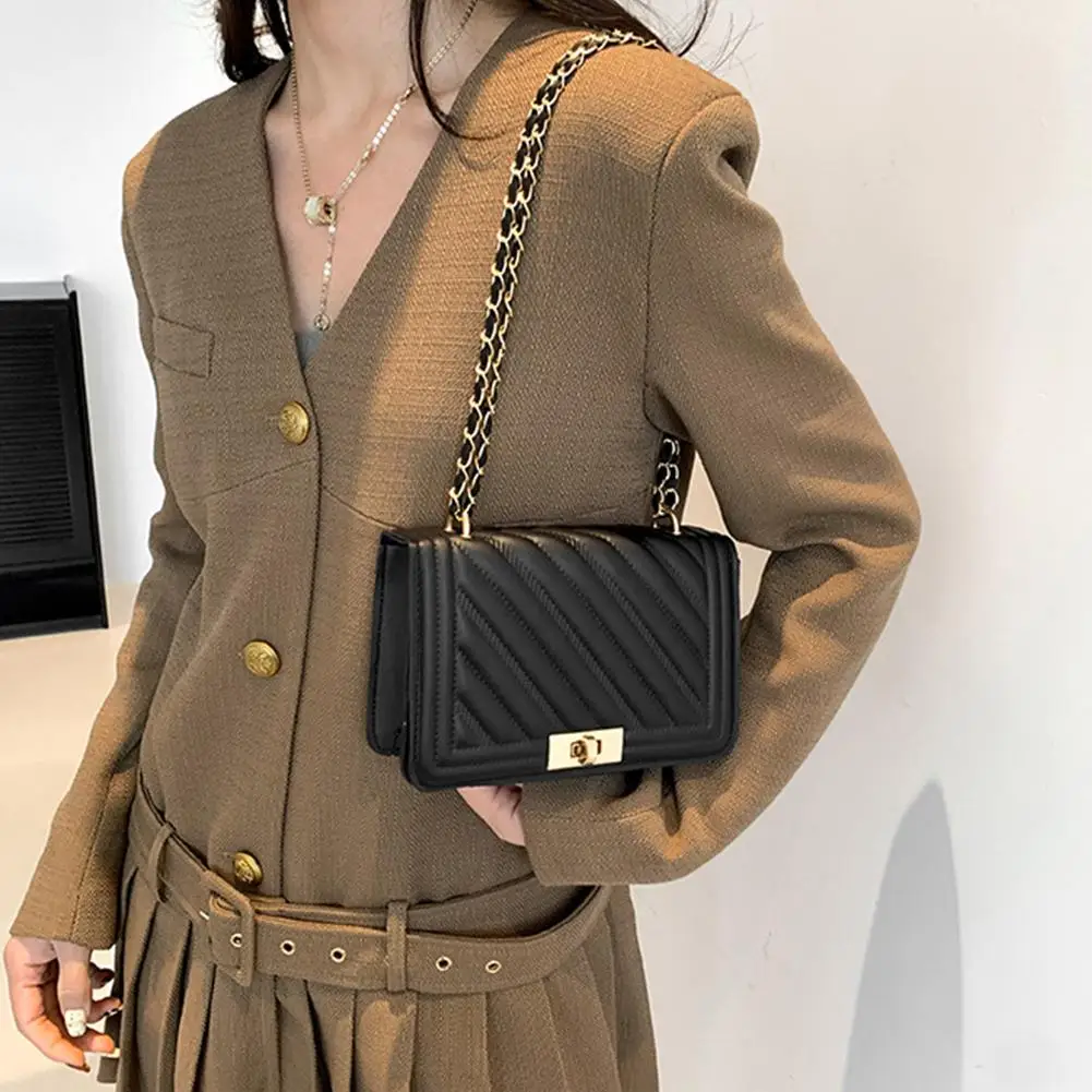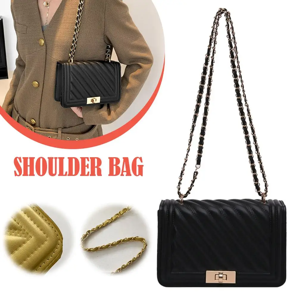 2. Elegant Hardware & Chain Strap: The bag is accentuated with gleaming gold-tone hardware, including a secure turn-lock clasp that adds a sophisticated accent. The versatile chain strap, interwoven with matching material, allows for comfortable wear as a shoulder bag or a crossbody.